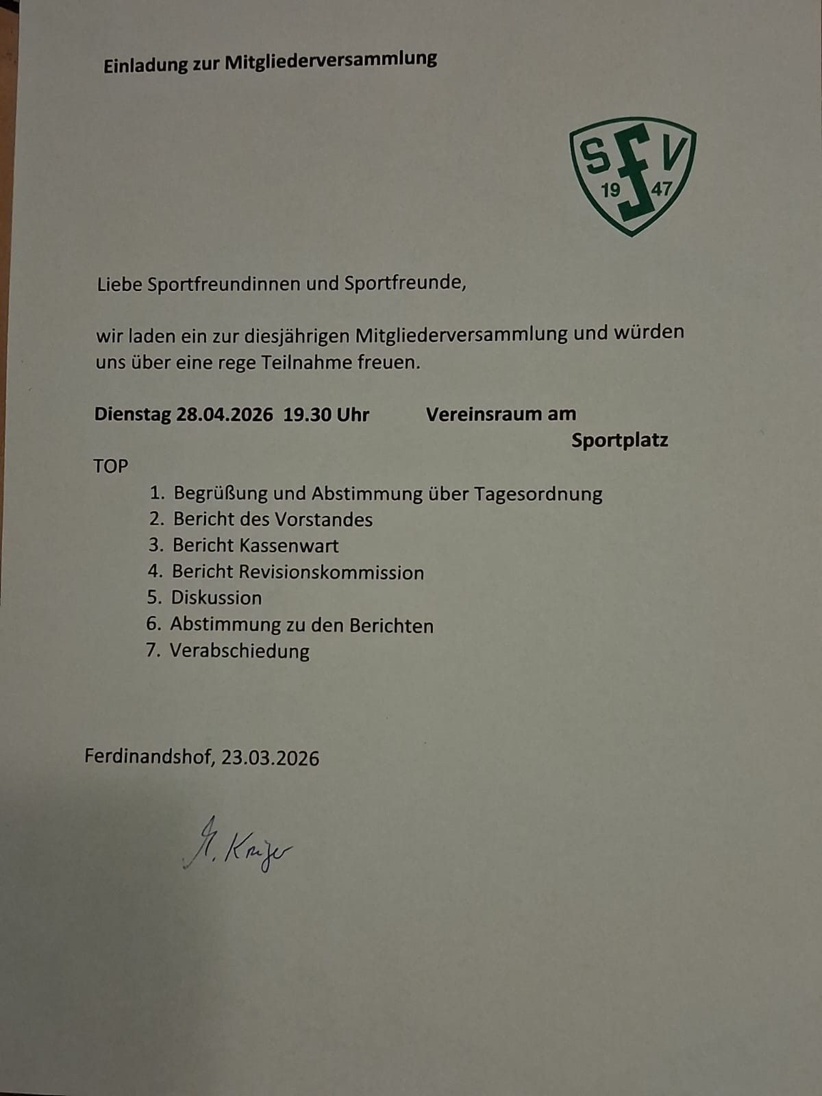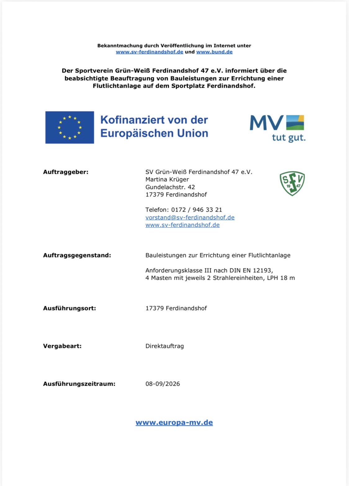 Der Sportverein Grün-Weiß Ferdinandshof 47 e.V. informiert über die
