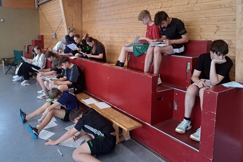 In Vorbereitung auf die neue Saison (die Mädchen spielen in der Landesklasse, die Jungen U 18) führten wir am 12.07.2025 in eigener Halle einen Schiedsrichterlehrgang durch. Klaus Bietz erläuterte die Theorie und nach 4 Stunden galt es, 44 Fragen richtig zu beantworten.